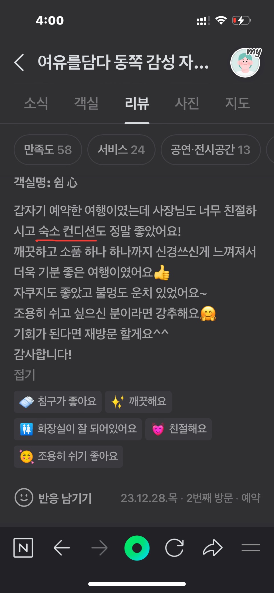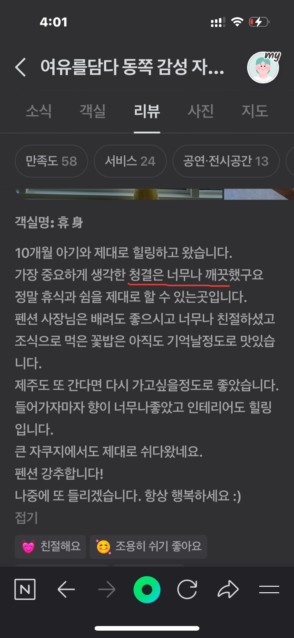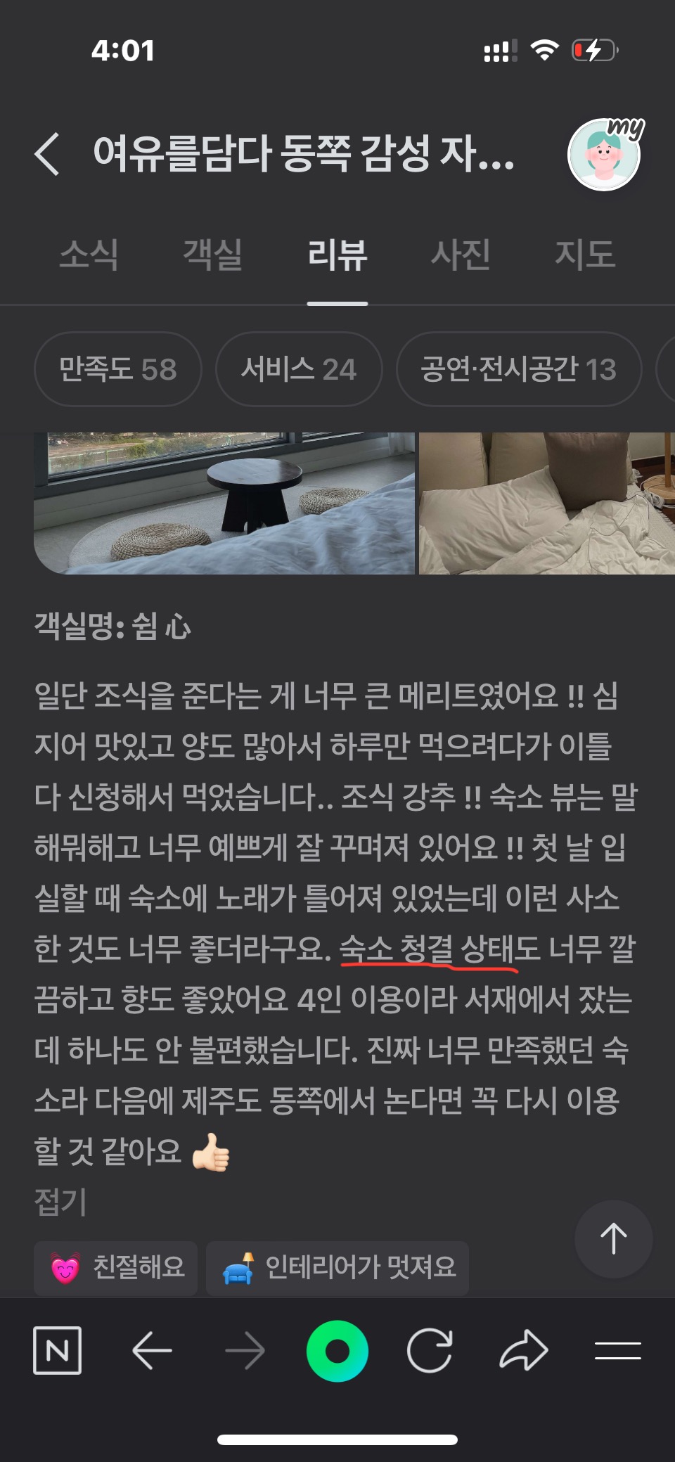 " 청결 , 믿음, 신뢰" 를 모토로 숙소 청소 전문 업체로 청결을 상태를 관리하고 있으며